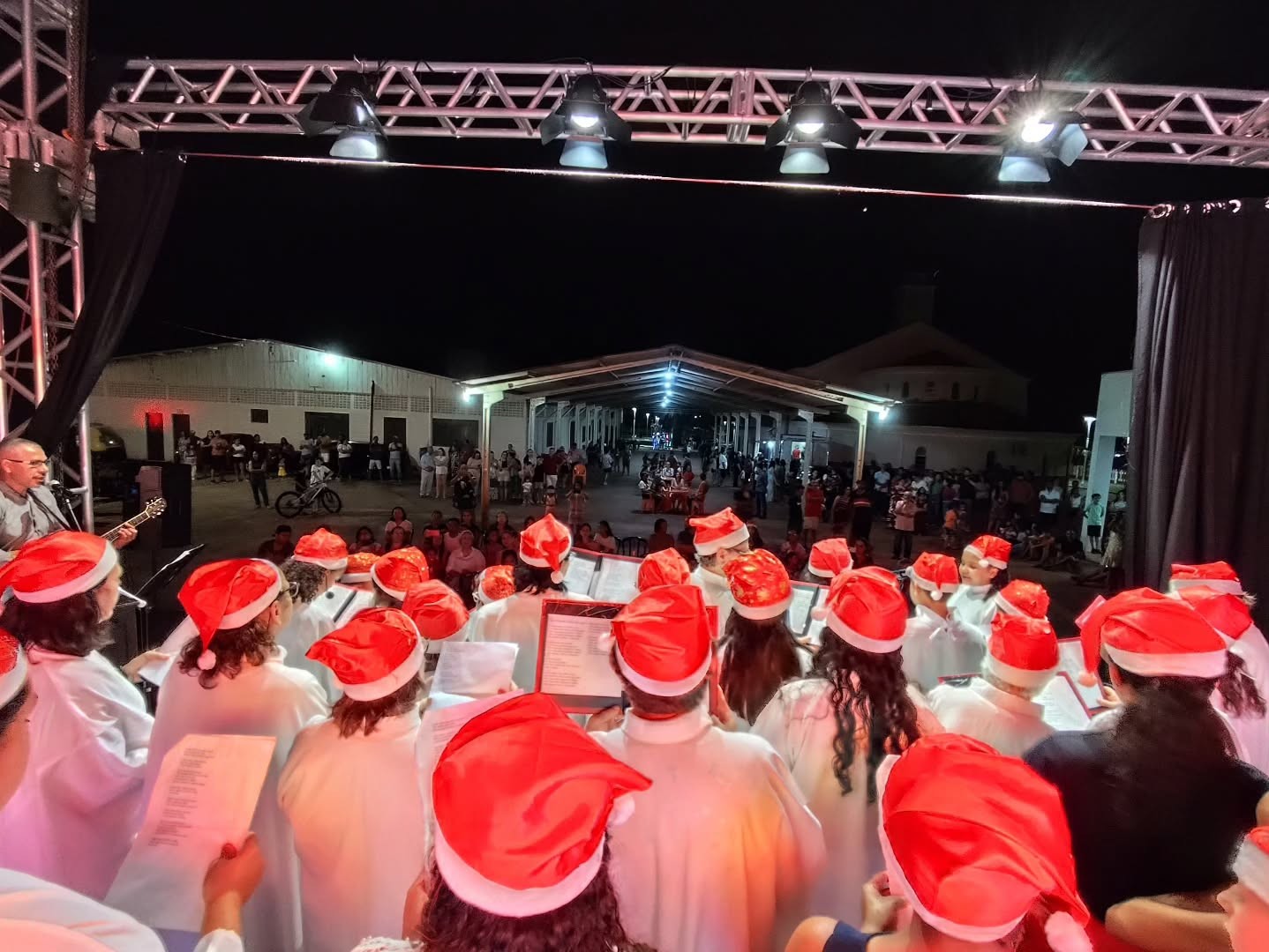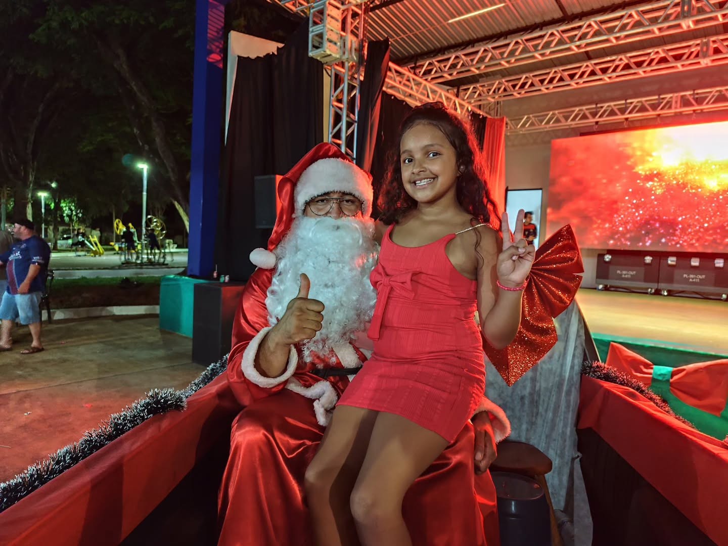 Mas o momento mais esperado da noite foi a chegada do Papai Noel, que trouxe sorrisos e presentes para as crianças. Com uma alegria contagiante, o bom velho distribuiu presentes e balas, criando um clima de pura magia e felicidade.